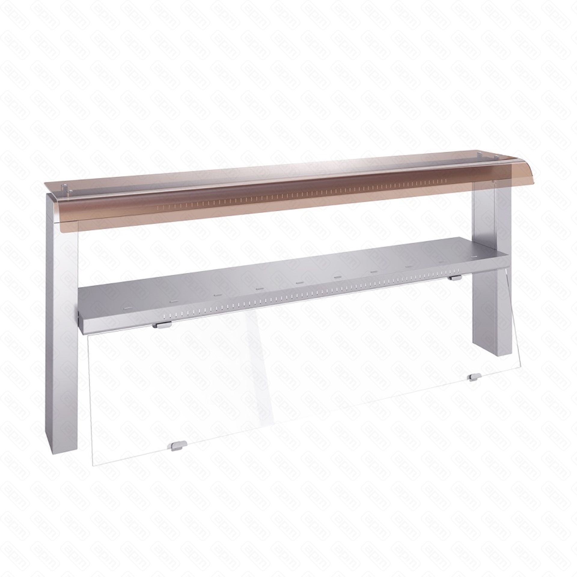 Конструкция сборная, бескаркасная. Полка выполнена из нержавеющей стали AISI430. В верхней части полки располагается гнутое стекло. Двухъярусная полка имеет два светильника. Один освещает столешницу, другой – среднюю полку. Двухъярусная полка имеет защитное стекло, предотвращающее попадание грязи на продукты. Особенности: