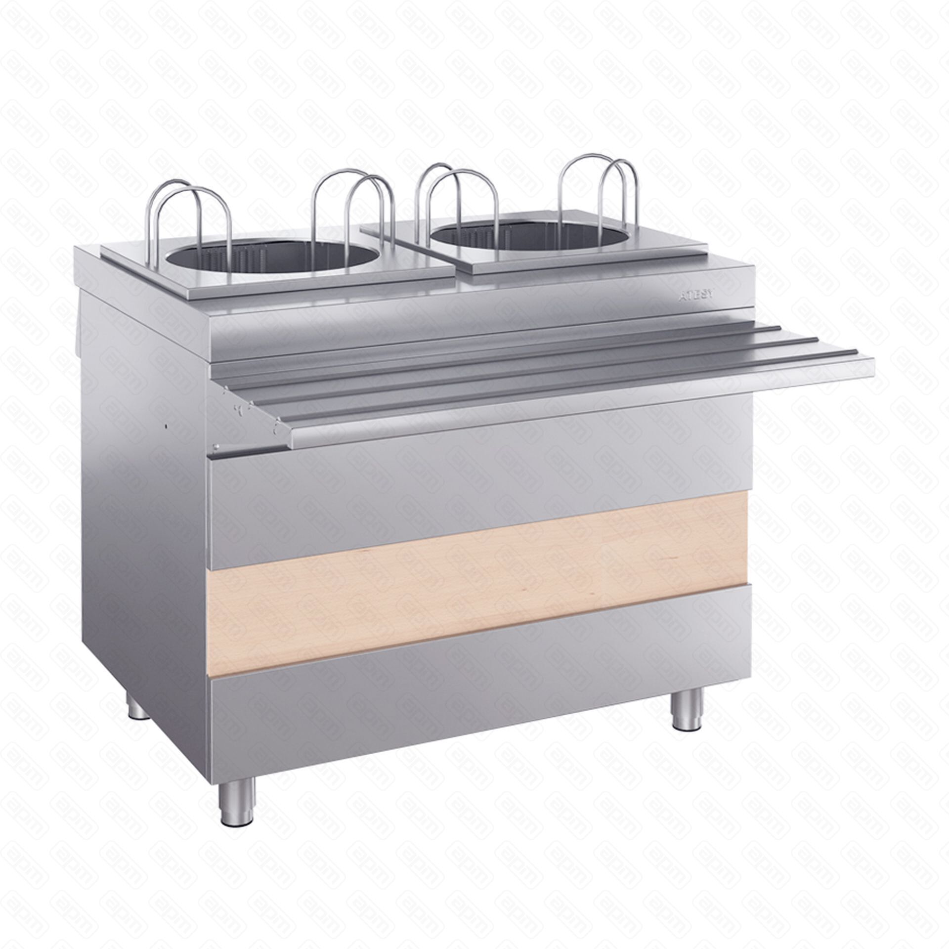 — Диаметр тарелок, мм: 160…320 — Температура подогрева тарелок, С: +30…+60 — Вместимость, тарелки: 90 — Конструкция сборная, бескаркасная — Столешница выполнена из нержавеющей стали AISI430 и усилена листом ламинированной ДСП толщиной 16 мм — В столешницу установлены две секции для размещения тарелок — В каждой секции можно разместить до 45 тарелок диаметром от 160 до 320 мм — Тарелки укладываются на платформу, поддерживаемую пружинным механизмом — Механизм удерживает над столешницей всего несколько тарелок — Остальные тарелки находятся в нагретом объеме — Подъем тарелок происходит автоматически по мере их использования — Подогрев тарелок внутри секций осуществляется ТЭНами общей мощностью 0,54 кВт — В верхней части модулей расположены ограничители из нержавеющего прутка, надежно фиксирующие стопку тарелок одного диаметра — Ножки модуля выполнены из нержавеющей стали, имеют пластиковую опорную часть и регулируют высоту модуля в пределах 20 мм — В комплект модуля входит направляющая для подносов (950х315 мм) выполненная из нержавеющей стали — Направляющая представляет собой сплошную поверхность с выпуклыми формовками для облегчения скольжения подносов — Направляющая модуля может соединяться с направляющими соседних модулей, формируя сплошную ровную поверхность — Вдоль всей фасадной части под столешницей расположена сменная декоративная панель 950х190 мм — Модуль может дополнительно оснащаться светильником под направляющей — Защитные лобовые стекла и козырьки (поставляются отдельно)