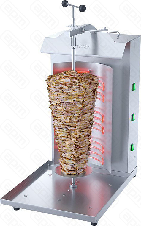 Гриль для шаурмы АТЕСИ 3-ЭЛ-05-ОЦ предназначен для жарки мясной начинки из курицы, свинины, говядины за счет тепла, выделяемого нагревательными элементами. Производит обжарку мясного филе, подготовленного согласно соответствующей рецептуре и размещенного на вертикальный вертел, который вращается вручную около нагревательных элементов (ТЭНов) до его готовности.